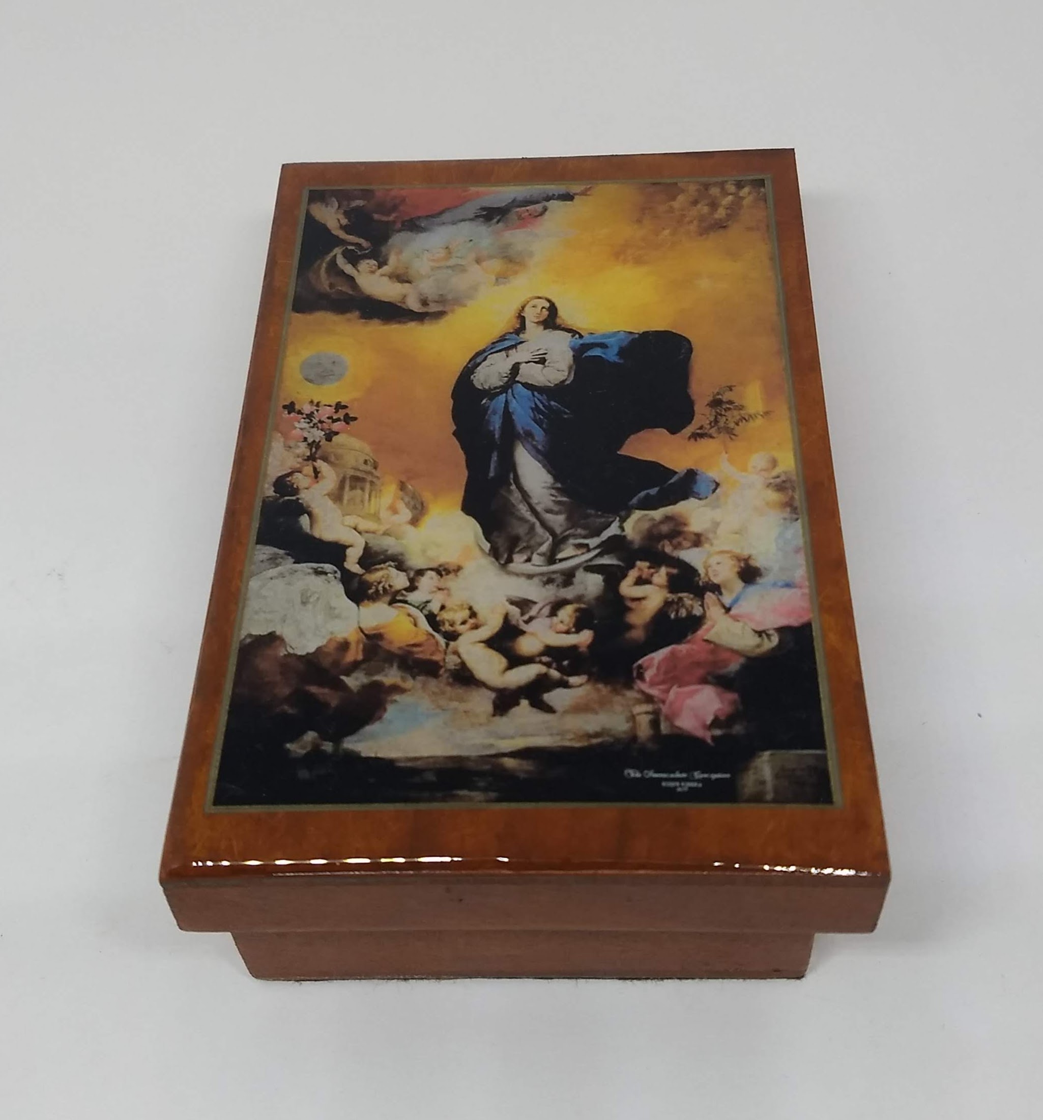 Caixa 14x9x5cm com imagem resinada. Imagem da Imaculada Conceição com aplicação de resina